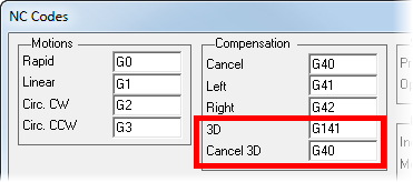 3D 刀具补偿仅适用于精加工操作和线性移动。如果为特征选择了 3D 刀具补偿,则任何圆弧切入都通过线性移动近似得出。XBUILD 补偿关键字(<COMP-STAT>、<COMP-START> 等)对 2D 和 3D 刀具补偿均有效(只有一种类型的补偿可以处于激活状态)。在 XBUILD 的“NC 代码”对话框中设置 NC 代码以打开和关闭 3D 刀具补偿: