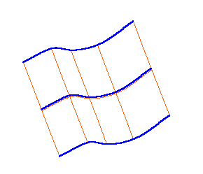 曲面使用以行和列形式排列的点矩形阵列进行定义;这些点不会显示。对于曲面上的任何位置,存在从一个曲面边界行进到另一个曲面边界的曲线。这些曲线称为等值线。在此图中,3 条蓝色曲线是行等值线,5 条橙色曲线是列等值线。