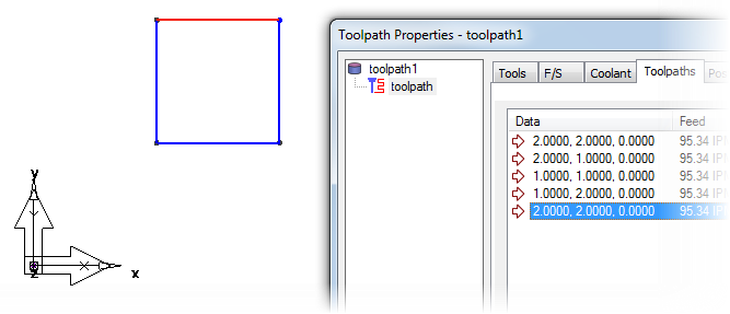 刀具路径显示为一系列的点。如果您在表中选择表,则移动将在图形区域中以红色显示。