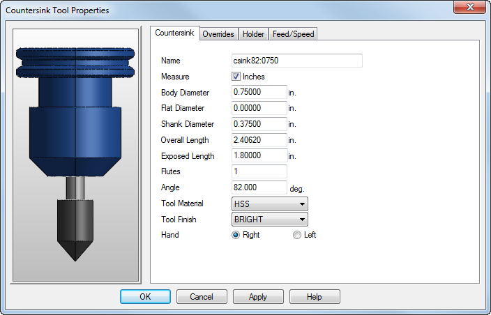 平坦面直径 - 倒角孔刀具可以有一个平坦的底部(可选)。参见图。