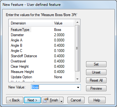 特征类型 - 选择“凸台”、“镗孔”或“盲孔”。
