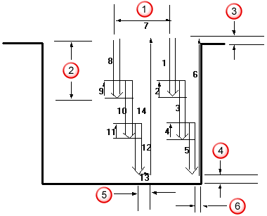 槽特征的粗加工方法是先平行于 X 轴下切,再退刀,接着在 -Z 方向上步进,然后再次下切。下图显示了槽粗加工算法和控制此过程的制造属性。