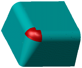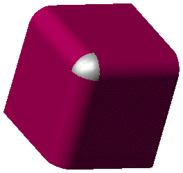 下图显示了三个曲面调配的示例。这种调配用于创建所谓的“手提箱圆倒角”。这意味着,您要创建三个圆倒角的交点,就像手提箱的拐角一样。如果使用 3D 建模创建圆倒角,则通常可以自动检测曲线。