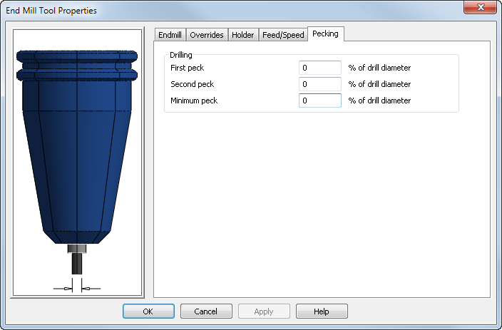 您可以使用“啄孔”选项卡来修调各个刀具的啄孔深度。全局啄孔深度值在“加工属性”对话框的“啄孔”页面上指定。