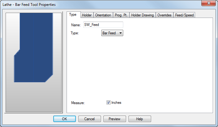 “棒料进给”刀具组表示棒料进给和棒料抽出。此刀具组具有“类型”选项卡,而不是“刀片”选项卡。