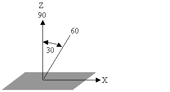 机床 X 限界与高于 XY 平面的角度相等。但是,它们并不是同一角度。下图对此进行了最恰当地描述。机床相对于 Z 轴测量角度范围,而 FeatureCAM 相对于 XY 平面测量角度范围。因此,该限界所需的角度是为机床指定的角度的补角。