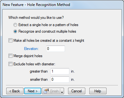 合并分散孔 - 选择此选项可将分散孔合并成单个特征。分散孔是互相堆叠且具有相同的直径和中心位置的同轴孔。此选项仅适用于 AFR。