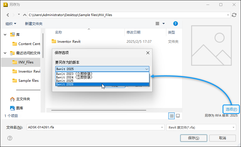 (可选)对于 RFA 文件,您可以指定要输出到的 Revit 版本(2023 及更高版本)。在“另存为”对话框中,单击“选项”,在“保存选项”中,为 RFA 文件选择 Revit 版本。