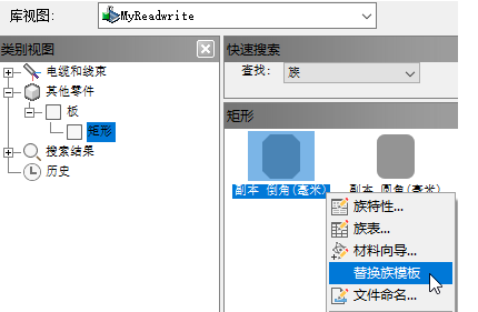 选择在步骤 3 中保存的板,单击鼠标右键,然后选择“替换族模板”。