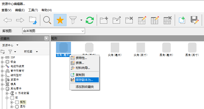 打开“资源中心编辑器”。如果没有打开文档,通过“工具”>“资源中心”>“编辑器”进行访问。在零件或部件文档中,通过“管理”>“资源中心”>“编辑器”进行访问。选择“自定义标准件库”,选择所需的板族,选择端板以接收孔,然后单击鼠标右键以选择“保存副本为...”。