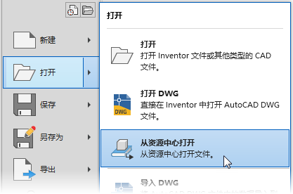 单击 Inventor 界面左上角的“文件”菜单,然后选择“从资源中心打开”。