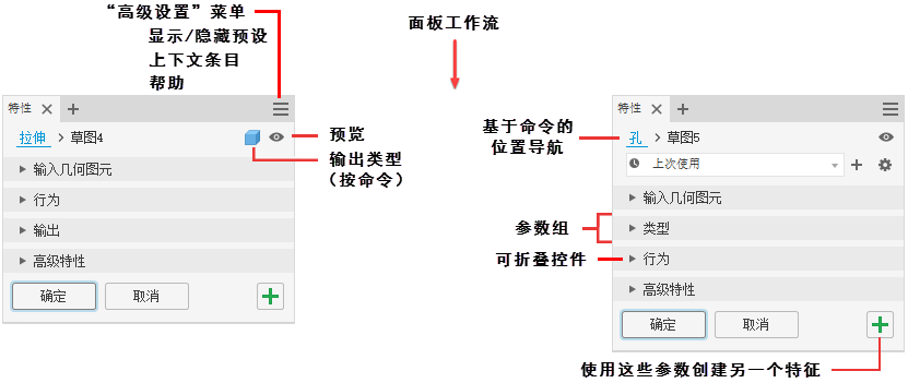 特性面板支持上下文访问用于创建和编辑特征的参数。