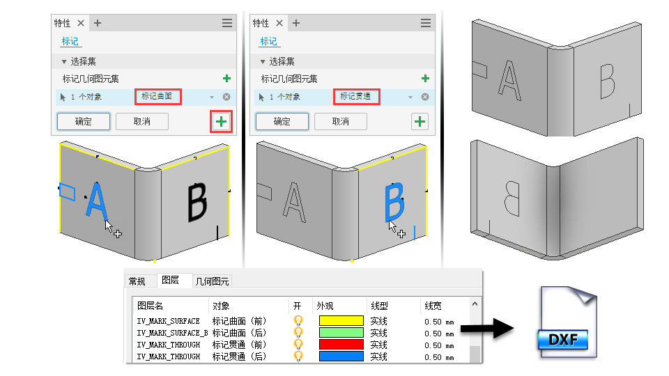 ,并继续选择文本或草图几何图元。您可以为每个成员设置“标记曲面”或“标记贯穿”。