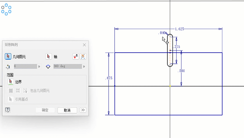 (可选)在“范围”部分中,单击“边界”,然后在画布中,在您定义的边界内单击。边界是绘制或投影的草图。指定有界阵列的包含方法。选择范围: