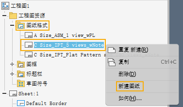 在浏览器中,展开“工程图资源”“图纸格式”。在图纸格式上单击鼠标右键,然后选择“新建图纸”。