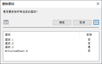 (可选)若要更改选定的要删除的图纸,请在“删除图纸”对话框中单击“更多”,然后单击“删除”以指定要删除的图纸。