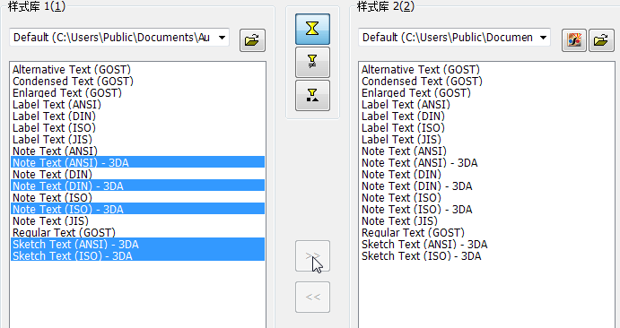显示唯一的样式:显示一个库中存在而另一个库中不存在的样式。使用此设置时,样式名称为斜体,并以蓝色显示。将样式库移植到新版本的 Inventor 后,选择要复制到新库的样式集合(如果有)。例如,从“样式库 1”窗格中选择一个样式。选择一个或多个样式后,单击“将选定样式从样式库 1 复制到样式库 2”以将其添加到新库中。