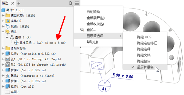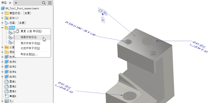 所有三维标注都放置在模型浏览器中的文件夹中。使用文件夹关联菜单中的“隐藏所有标注”可隐藏所有三维标注。