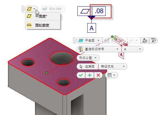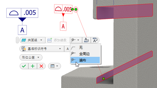 “包容条件”修饰符现在可用于孔注释和尺寸。在标注预览中,单击尺寸,然后在工具栏中选择包覆面修饰符。