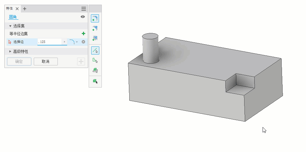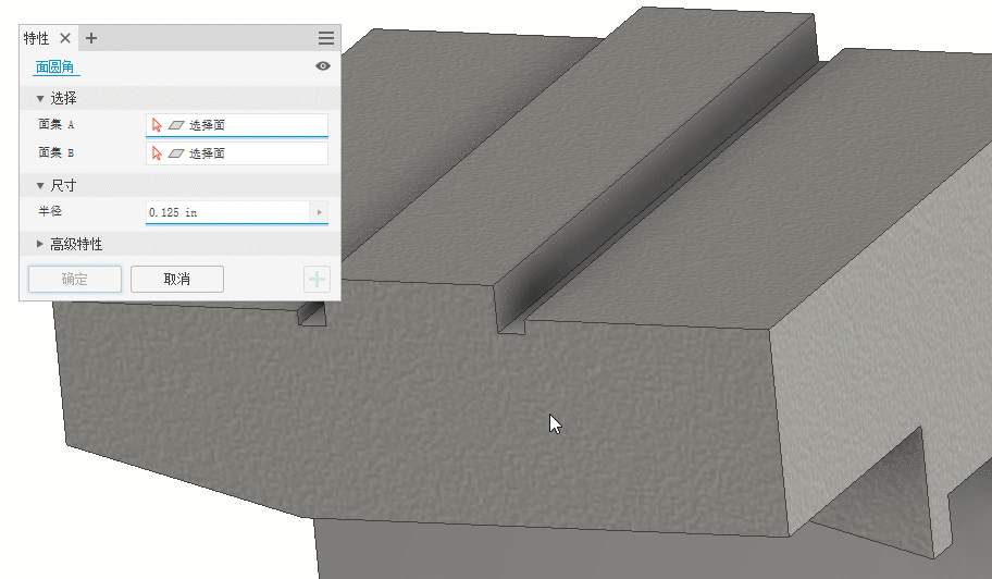 在单个实体的两个非相邻面之间添加圆角特征。如果存在连续特征,则这些特征将被封口并填充以创建圆角。