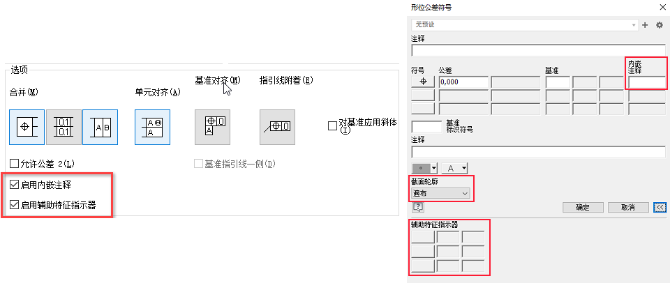 您还可以根据 ISO 5458 和 5459 标准在“形位公差符号”对话框中输入前缀、后缀和辅助特征指示器。首先,使用“样式和标准编辑器”对话框中新增的复选框启用相应选项。另请注意,当您填充单元时,单元将变为启用状态。