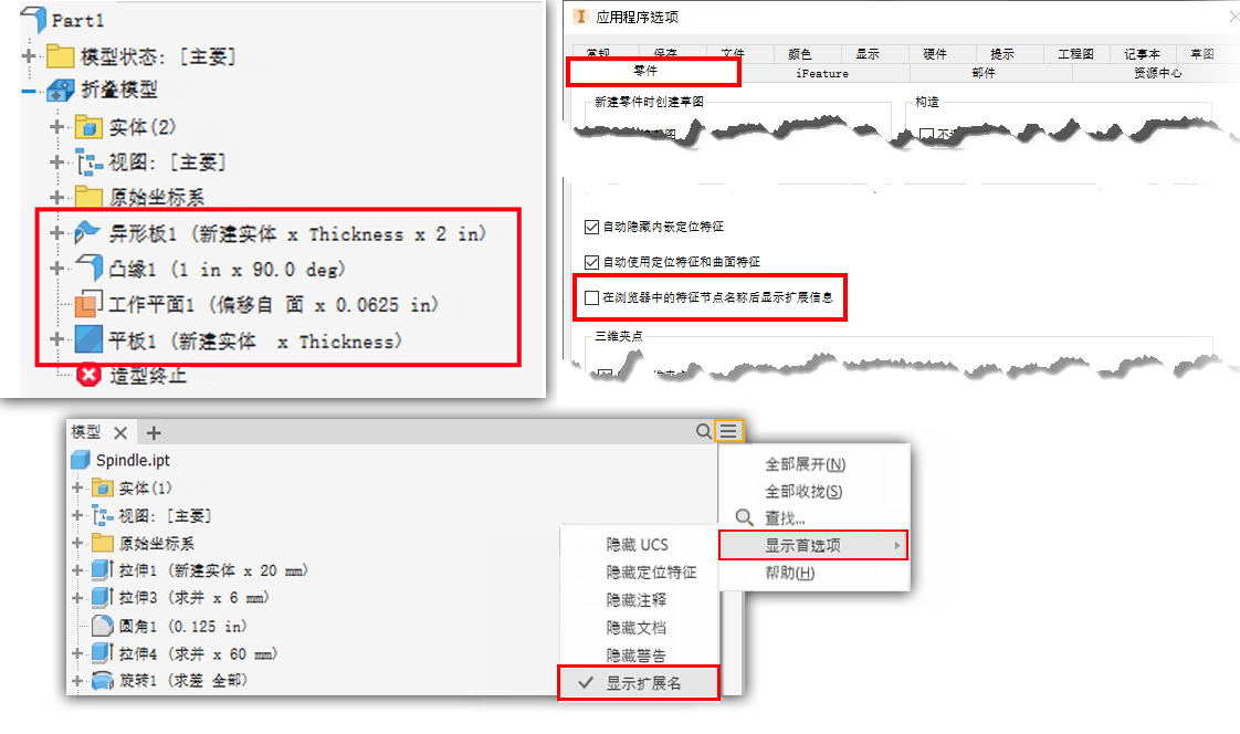 钣金:扩展浏览器信息可用于钣金零件。可以从“应用程序选项”>“零件”选项卡或从浏览器节点激活该选项。