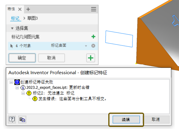 某些情况可能会导致出现错误消息,例如,当编辑导致草图几何图元不再位于模型几何图元上时。当发生这种情况时,您可以从错误对话框中编辑草图并快速解决问题。