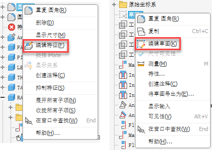 现在,可以使用关联菜单中的快捷键直接编辑草图或特征。选择特征或草图,单击鼠标右键,然后使用快捷键。以下快捷键可用: