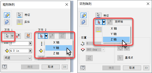 特征阵列命令“矩形”和“环形”现在具有一个选择器弹出菜单,可用于访问基准轴。