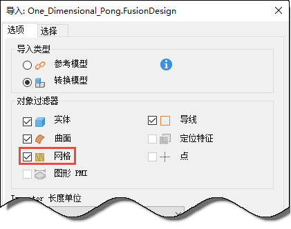 打开包含画布数据的 Fusion 360 Electrical 设计。指定导入选项时,在“对象过滤器”下,包括“网格”。