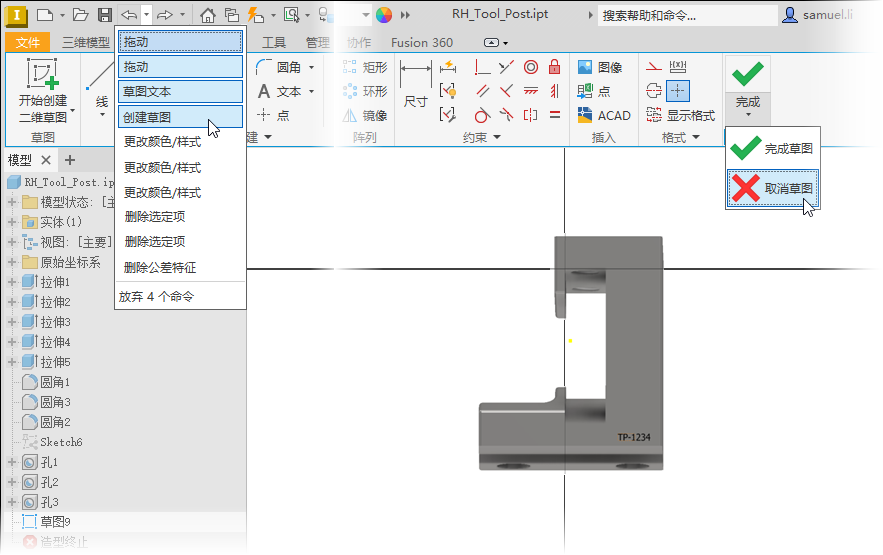 启动或编辑草图时,“取消草图”命令将使用“完成草图”命令填充功能区。