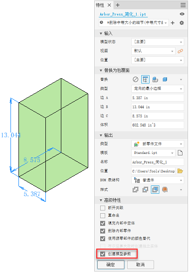 向特性面板的“高级特性”中添加了一个新的“创建模型参数”选项。选中该选项后,系统会在简化的文件参数窗口中为“边 A”、“边 B”和“边 C”创建三个只读参数。