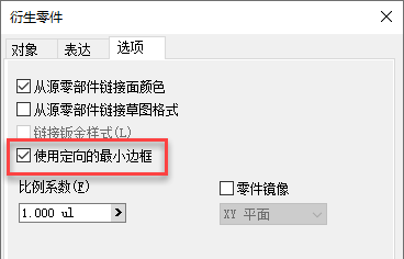 从此版本开始,您现在可以使用定向的最小边框衍生实体。向“衍生零件”、“衍生部件”和“生成零件”对话框的“选项”选项卡中添加了一个新的“定向的最小边框”选项。默认情况下,该选项处于选中状态。取消选中该框可使用正交边框衍生实体。