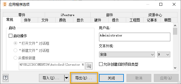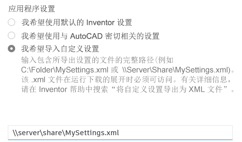 | 在“应用程序选项”对话框中,单击“导出”。导出操作会将当前的应用程序选项以及“iLogic 配置”对话框中的设置保存到一个 .xml 文件中。 | 创建展开时,请选择“我希望导入自定义设置”,然后输入导出的 .xml 文件的路径。 |