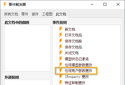“事件触发器”对话框中有一个名为“任何用户参数更改”的新事件。当您更改用户参数的值时,会触发此事件。