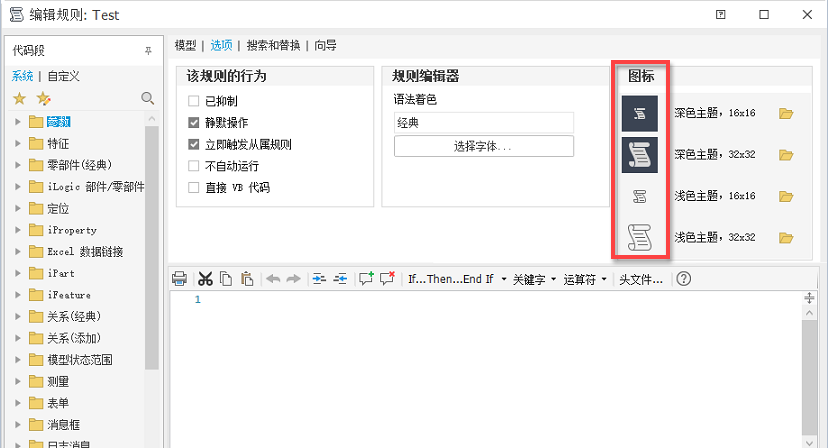 在规则编辑器(对于外部规则)的“选项”选项卡中,将显示当前图标。单击文件夹按钮将打开一个文件对话框,从中可以从任意文件夹中选择其他位图文件。您选择的文件将复制到与规则相同的文件夹,其名称将按照命名约定进行更改。对于小图像,建议的图像分辨率(以像素为单位)为 16x16;对于大图像,为 32x32。但是,其他尺寸将会自动缩放。