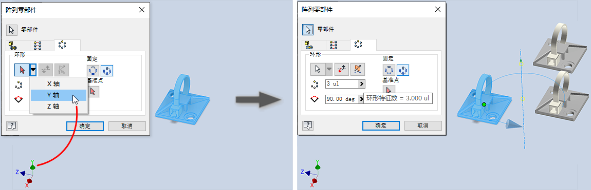 有关详细信息,请参见创建零部件的矩形阵列和创建零部件的环形阵列。