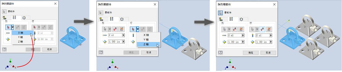 为了使用基准轴来加速创建阵列,“阵列”对话框中现在提供了这些轴。单击选择器以访问轴弹出菜单。