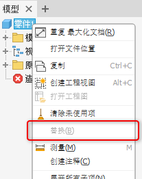 此变更会影响零件文档。因此,即使在新零件文档中,关联菜单也会显示只读替换状态。它处于取消选中状态。