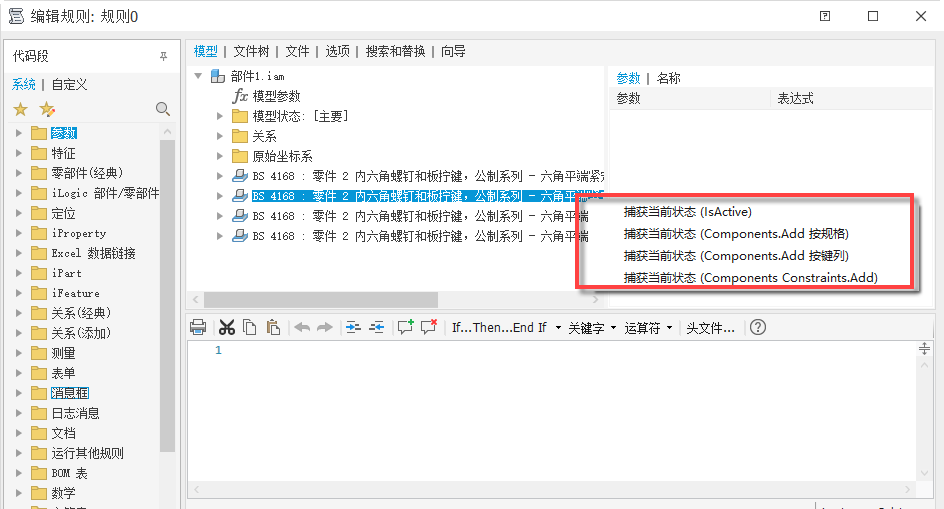 资源中心零件的 iLogic 规则编辑器中添加了一个用于捕获当前状态的新选项。该选项不捕获规格,而是获取键值并为代码提供名称值列表。这样可以更轻松地指定各个所需值,而不必将它们合并为一个规格值。