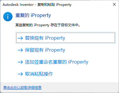 将特性粘贴到其他文档时,如果存在重复项,系统将提示您执行所需的操作:
