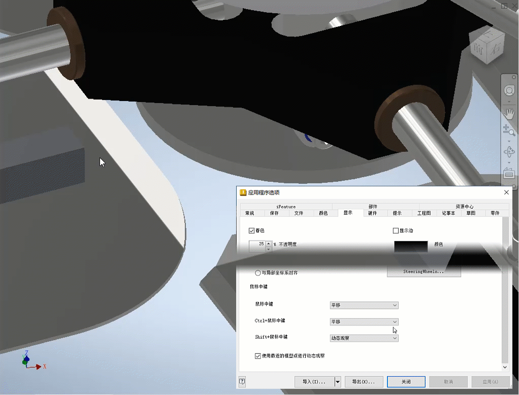 在选中该选项的情况下放大设计时,动态观察将使用最近的模型点。将光标放在要用作轴心的模型点附近,然后按住 Shift 键并使用鼠标中键围绕模型点进行动态观察。取消选择该选项后,动态观察轴心将对应于三维最小边界框的中心。