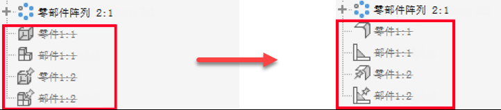 在部件浏览器中,抑制的钣金和焊接零件的图标已更新,以反映未抑制图标的外观。请注意,旧的抑制的钣金和焊接件图标需要解除抑制并再次进行抑制,才会更改为新图标。
