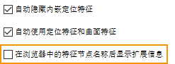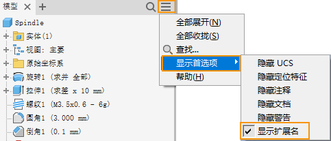 “在浏览器中的特征节点名称后显示扩展信息”(位于“应用程序选项”/“零件”选项卡中)和“显示扩展名”(位于“模型”浏览器工具的菜单中)选项已得到增强,可支持以下命令: