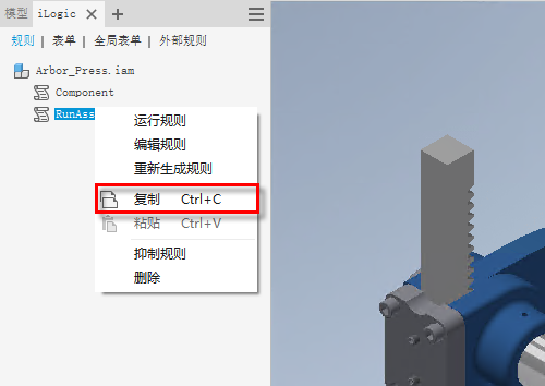 现在,在 iLogic 浏览器中复制和粘贴规则变得更容易了。可以直接在浏览器中选择 iLogic 规则,使用关联菜单中的“复制”命令,然后将其粘贴到其他零件或部件中。