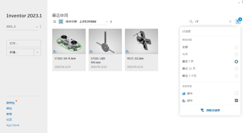 使用预定义过滤器过滤“最近使用”列表和搜索结果。可以按文件类型、修改日期过滤,并可以轻松清除过滤条件。