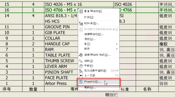 现在,从明细栏中编辑零部件特性变得更为简单。选择零部件行,单击鼠标右键,然后选择“iProperty”。