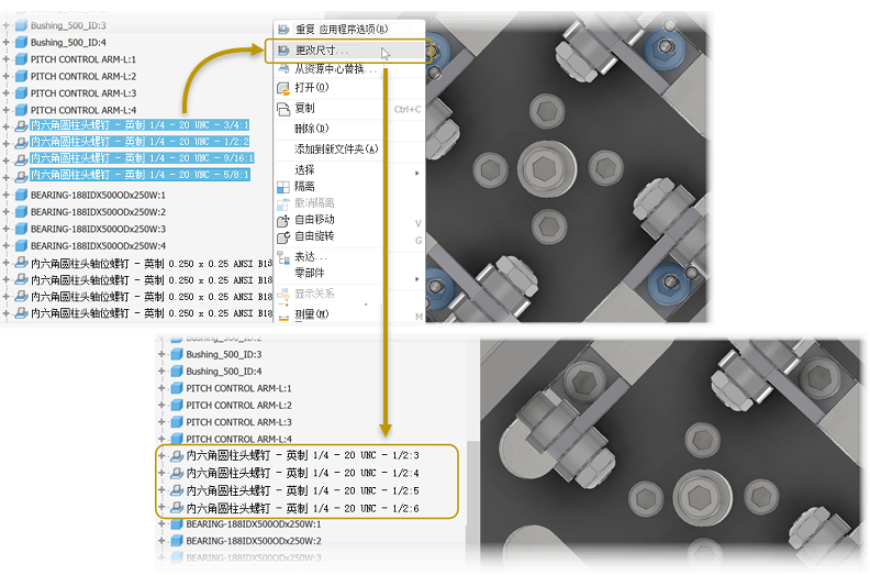 现在,您可以选择同一族的多个资源中心零部件,并将所有选定零部件的尺寸更改为一个尺寸。当所有选定的零部件属于同一族时,“更改尺寸”将会启用,无论零部件的尺寸如何都是如此。零部件对话框将使用选择的第一个零部件的参数进行填充。
