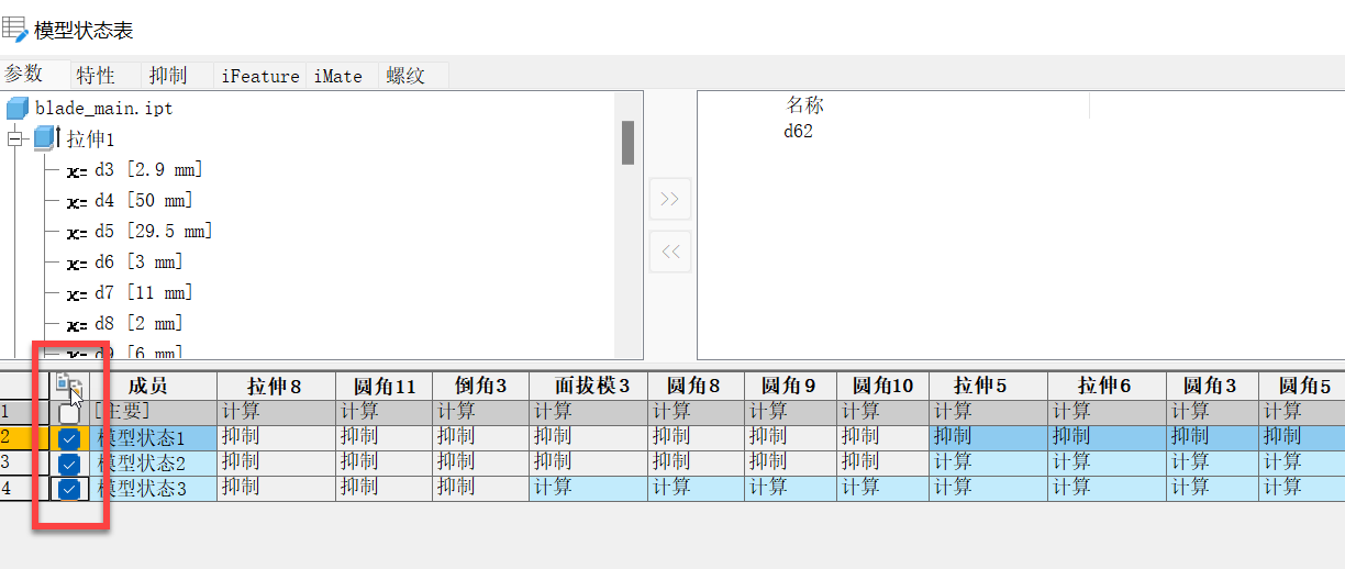 在编辑 iComponent 或模型状态表时,新增了一个带复选框的“比较”列用于选择行。默认情况下,所有行都处于取消选中状态。选中或取消选中行以将其添加至或移出对比项。
