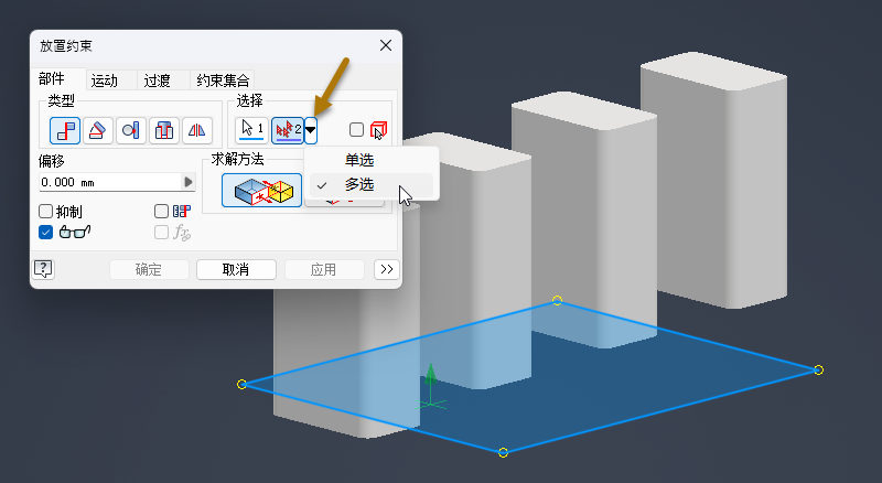 对于配合约束,现可批量选择与首个选定对象存在配合关系的多个约束。放置约束时,请使用“选择”区域中新增的“多选”弹出按钮选项。编辑状态下不可使用多选。